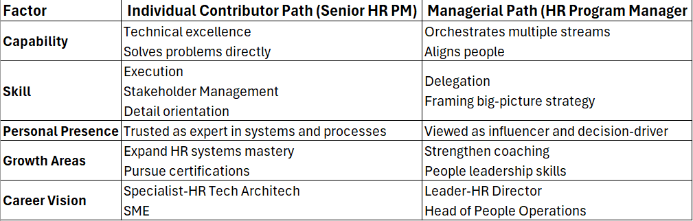 Outcome: Pursuing the Senior HR Project Manager (IC) role enables Ama to deepen her expertise, strengthen her technical credentials, and position herself as a future HR Systems Architect or subject matter authority.